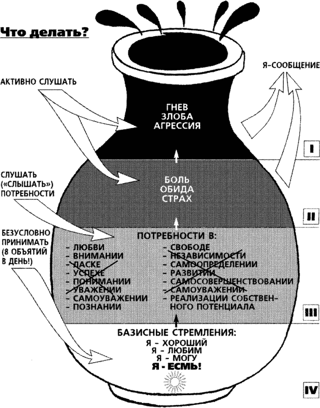 Изобразим снова «сосуд» наших эмоций. Пусть на этот раз он будет иметь форму кувшина (см. рис. 10.1)[4]. Поместим гнев, злобу и агрессию в самой верхней его части. Тут же покажем, как эти эмоции проявляются во внешнем поведении человека. Это – так, к сожалению, знакомые всем обзывания и оскорбления, ссоры и драки, наказания, действия «назло» и т. п.