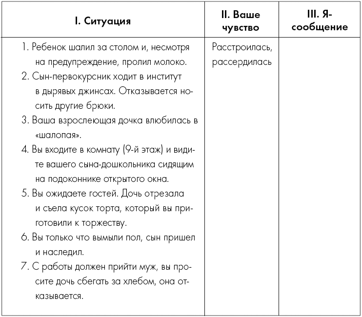 Задание третьеА теперь, имея в виду то чувство (или чувства), которые вы записали против каждой ситуации, напишите в столбце III ваше «Я-сообщение».