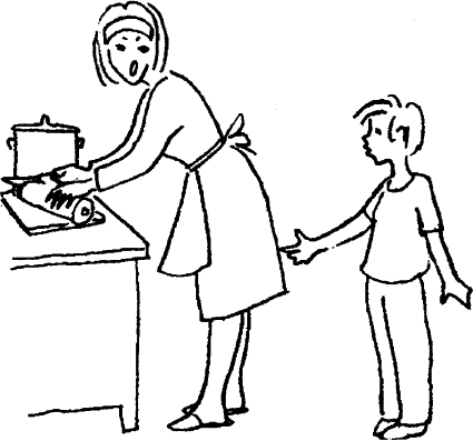 МАМА: То есть ты пока не голоден. (Активное слушание.) Хорошо, у нас есть время подождать папу. Он придет, и мы будем есть вместе. Но если ты проголодаешься, я могу покормить тебя и раньше. (Показ возможного выбора.) Ты будешь есть на ужин кашу или жареную картошку? (Возможность выбора.)