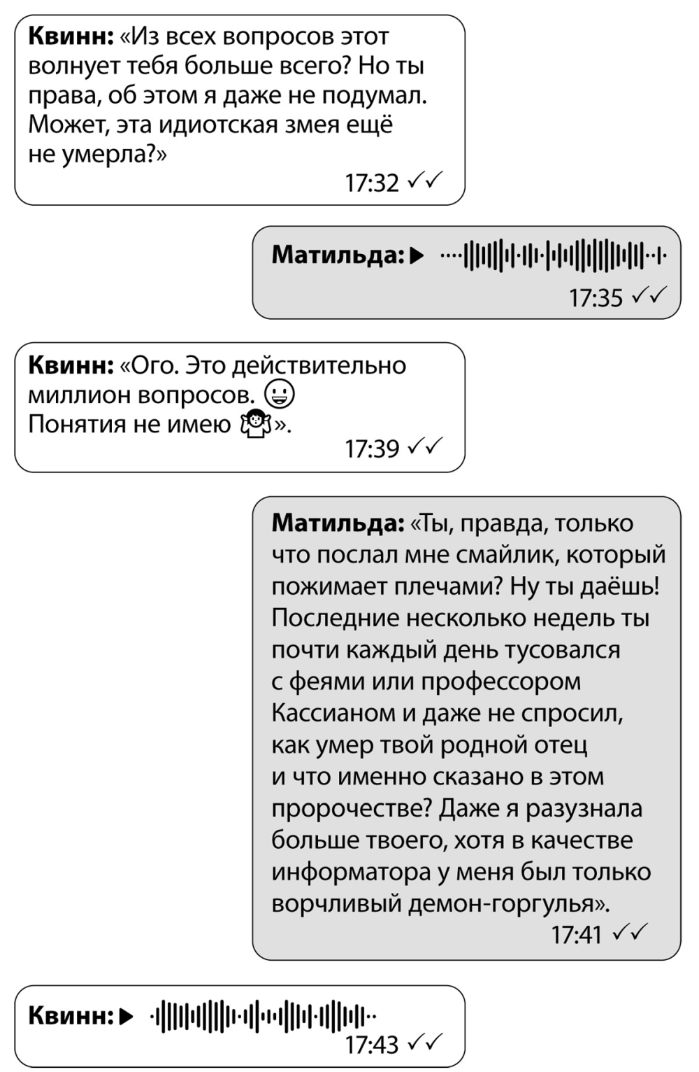 – Меня… э-э-э… часто не было дома, – неопределённо ответила она, а затем, не переводя дыхания, выпалила: – А ты? Как поживают профессор Кассиан и феи? Завёл ли Гиацинт новых ворон? Ты снова разговаривал с Ницше? Не довелось ли тебе за это время полетать на ките-цепеллине? Имела ли Жанна в виду профессора, когда утверждала, что знает твоего деда? Что нового ты выяснил о пророчестве? Ты уже выучил текст на память? Как поживает Конфуций? Куда и зачем Северин хотел тебя забрать? И зачем Жанна ему помогала? Успокоился ли Гектор?
