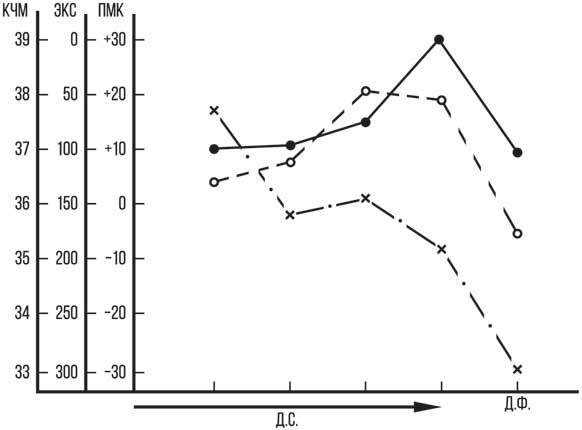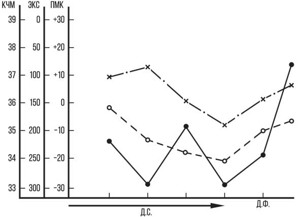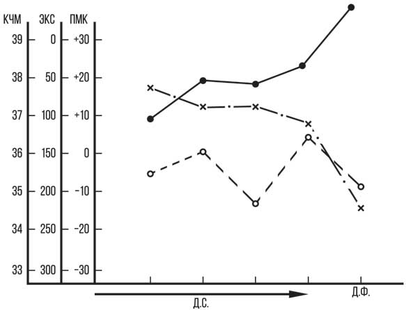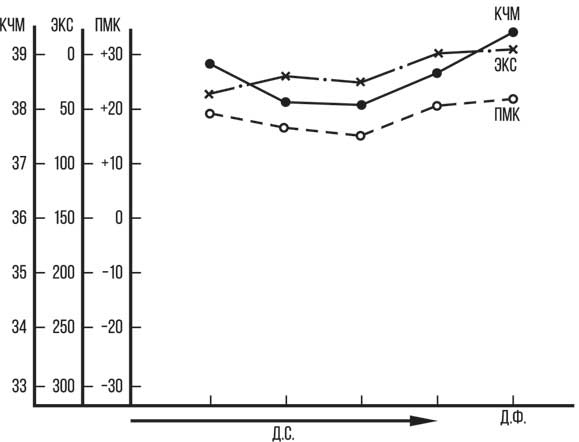 Рис. 1. Динамика состояний спортсмена. Равномерный рост показателей в дни соревнований: ДС – дни соревнований; ДФ – день финала; КЧМ – критическая частота мельканий световых сигналов (Г); ЭКС – электрокожное сопротивление (ом); ПМК – психомоторные пробы на кинематометре (град.)