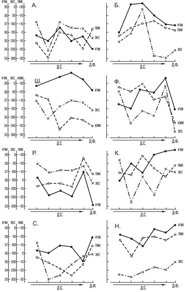 Примеры индивидуальных графиков с таким вариантом динамики приведены на рис. 1 и 2. В этих случаях можно говорить о том, что динамика функций согласована («взаимосодействие», по П. К. Анохину). Как правило, у спортсменов, выступивших в соревновании успешно, показавших высокие по своим возможностям и подготовке результаты, обнаруживается примерно такой или близкий к этому вариант индивидуального графика. Оба спортсмена, чьи результаты в дни ответственных соревнований приведены на графиках, стали победителями в своих видах.