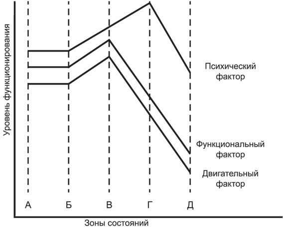 На схеме выделены четыре основные зоны. Первая (А – Б) характеризует дострессовое состояние с различными индивидуальными волнообразными колебаниями показателей, которые практически никогда не представляют в динамике горизонтальную линию. Начиная с точки Б отмечается подъем уровней всех показателей, и на протяжении зоны Б – В динамика функций однонаправленна и согласованна. Это первая фаза приспособления к стрессовым условиям. В этот период повышенный уровень функций и их согласованность благоприятно сказываются на результативности деятельности. Такой гиперкомпенсаторный подъем необходим спортсмену, чтобы показать высокий результат (иногда даже более высокий, чем достигает спортсмен в тренировочных условиях). Именно такой эффект Г. Селье именовал эвстрессом. Этот период подтверждает, что функционирование физиологических систем при нервно-психическом напряжении, вызванном стрессовыми условиями, носит избыточный (гиперкомпенсаторный) характер, включаются резервные возможности организма. Повышенное и согласованное функционирование говорит об адекватности приспособлений не только отдельных функций, но и всего организма как единого целого.