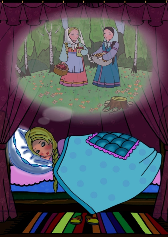 С этими мыслями Алёна и заснула. Снится ей лес и чудесная поляна, усеянная грибами и ягодами. Ходят они с сестрой собирают, полные лукошки набрали, унести не могут. Тут, на их счастье, мужик едет на телеге. Согласился он девушкам помочь. Нагрузили они всю телегу припасами и домой их привезли.