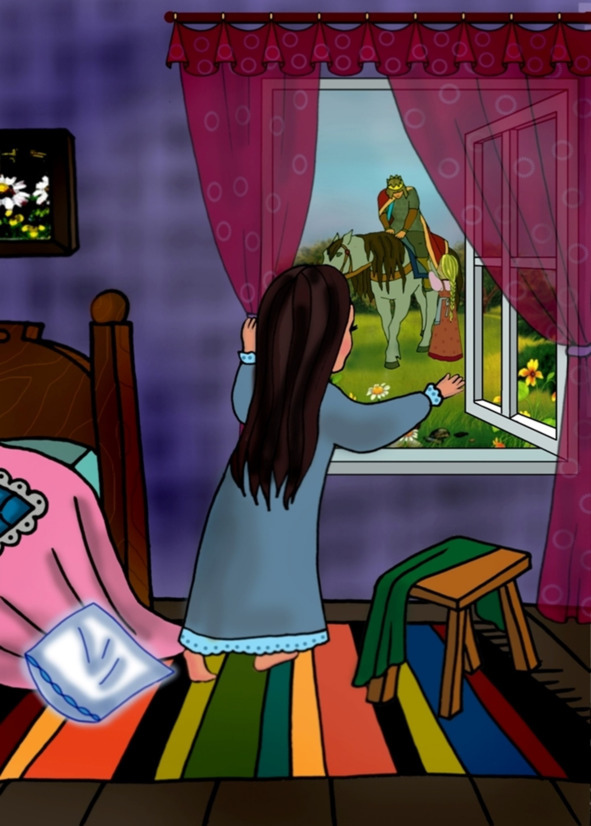 Клара спать любила до полудня, но от шума во дворе проснулась. Выглянула она в окно и обомлела. Уезжает её сестра с молодым красавцем князем и дружиной. И видно, как юноша влюблёнными глазами на Алёну смотрит, и она ему такой же любовью во взгляде отвечает.