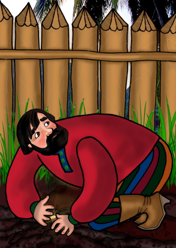Купец на своём поле вырыл ямку и закопал в неё золотое зёрнышко. Да так таился, так прятался, чтобы крестьянин не приметил это место, что сам его позабыл. Вначале встревожился, испугался, но потом успокоился: «Хитро я придумал. Зерно волшебное, золотое – ухаживать за ним не надо. Труда оно никакого не требует. Надо только подождать, когда золотая пшеница вырастет».