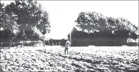 Bauernhof Gitt in Raineck. Im Vordergrund steht mein Vater auf dem Feld. Rechts: Stall mit davor stehender Baumreihe. Links: Hinter den hohen Birken befindet sich das von hier aus nicht sichtbare Wohnhaus, 1943.