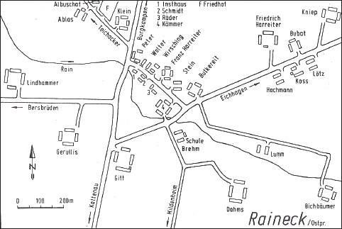 Den Sommer 1945 verbrachten wir – meine Tanten Lina und Marie, mein Großvater und ich – immer noch in dem Nachbarhaus von Frau Troyka. Rena war im März von Russen zu dem etwa sechs Kilometer entfernten Gutshof Schmückwalde gebracht worden, der schon zur Kolchose umfunktioniert worden war. Dort musste sie schwere Arbeit in der Mühle verrichten. Mein Großvater baute im Sommer einen zweirädrigen Handwagen mit einer Ladefläche von etwa 2 × 2 Metern. Er hatte die Idee, zu Fuß nach Raineck zurückzugehen (Luftlinie = 160 km). Dazu ist es nie gekommen. Vielmehr wurde der Wagen für einen sehr traurigen Zweck benutzt: Durch das Dorf fuhren regelmäßig vier russische Lkw, die von uns sehr argwöhnisch beobachtet wurden. Als eines Tages ein Vater mit seiner erwachsenen Tochter Kartoffeln aus der Miete (= Kartoffelvorrat, der mit Stroh und Erde abgedeckt war) holen wollten, kamen gerade diese Autos vorbei. Erschrocken rannten die beiden über das freie Feld. Das war ihr Verderben, denn wer weglief, galt als Partisan. Die Wagen stoppten, und ein russischer Fahrer erschoss die Flüchtenden. Opas Wagen wurde nun zum Abtransport der Leichen benutzt. Auffällig war für uns, dass in der Folgezeit nur noch drei Lkw durchs Dorf fuhren.