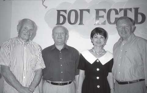 Von links nach rechts: Prof. Anatoli Rogow, Dr. Harry Tröster, Schirinai Dossowa und Werner Gitt, August 2004.