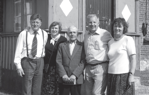 Vor dem Wohnhaus von Henryk Wozniak in Peterswalde. Von links nach rechts: Übersetzer Henryk Mach, Gunda Perteck, Henryk Wozniak, Werner und Marion Gitt (Mai 2005).