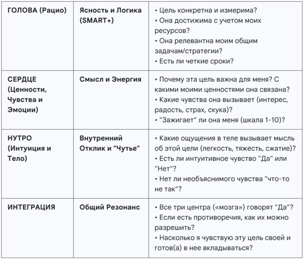 в) Прогнать цель через вопросы к Сердцу (Ценности? Эмоции?) и Нутру (Ощущения?). Найти личное «Зачем?».