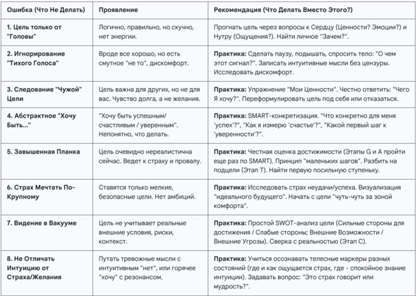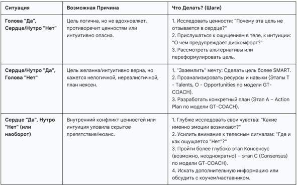 Возникновение противоречий между Головой, Сердцем и Нутром – это не проблема, а ценная информация, указывающая на необходимость доработки цели (Goal).