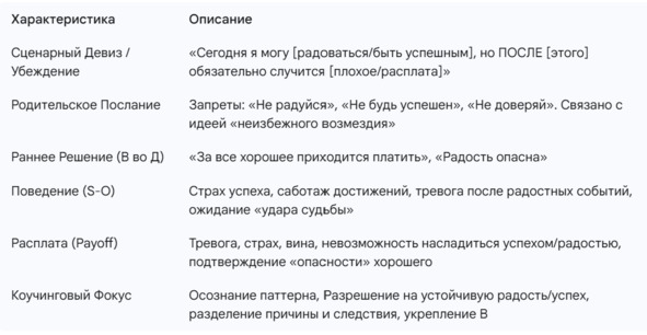 Расплата (Payoff): Главная расплата – это очередное подтверждение глубинного убеждения: «Я так и знал (а), что для меня это невозможно / я этого недостоин (а)». Это приносит парадоксальное, мрачное «удовлетворение» от подтверждения своей картины мира («Мир действительно ужасен / Я действительно никчемен») и снимает необходимость бороться, надеяться, рисковать и испытывать боль разочарования от неудач. Человек остается в своем привычном, хотя и мучительном, состоянии.