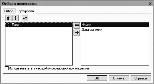 В правой части вкладки содержится перечень возможных признаков сортировки, в левой – те из них, которые необходимо применить. Перемещение признаков слева направо и наоборот осуществляется с помощью кнопок со стрелками, расположенных в центральной части вкладки. Порядок использования элементов сортировки и переключение направления сортировки выполняется с помощью кнопок со стрелками, которые находятся слева вверху вкладки. Если установить флажок Использовать эту настройку сортировки при открытии, то при последующих открытиях окна списка все позиции в нем будут по умолчанию отсортированы в соответствии с текущими настройками сортировки.