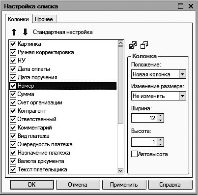 Данное окно состоит из двух вкладок: Колонки и Прочие. На вкладке Колонки путем установки соответствующих флажков следует указать колонки, которые будут отображаться в окне списка. По умолчанию установлены все флажки. Изменение порядка следования колонок в списке осуществляется с помощью кнопок со стрелками, которые находятся в левом верхнем углу вкладки. При необходимости можно быстро вернуться к настройке, используемой по умолчанию, – для этого следует воспользоваться кнопкой Стандартная настройка.