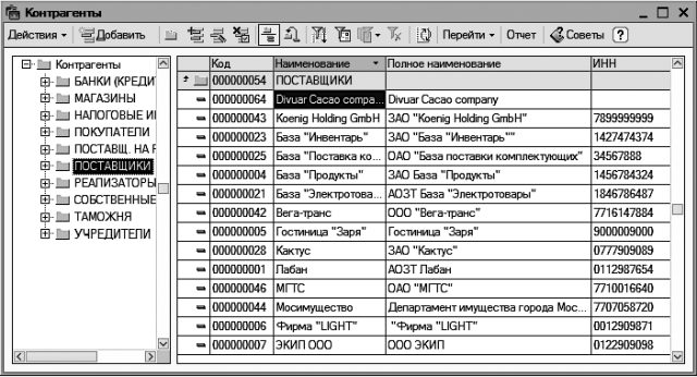 На рис. 1.19 представлено окно справочника контрагентов, которое, по сути, также является интерфейсом списка. Как видно из рисунка, оно состоит из двух панелей: слева формируется перечень групп контрагентов (Покупатели, Поставщики, Заказчики и т. д.), а справа отображается содержимое текущей группы. Я привел это окно лишь для примера, более подробно мы рассмотрим его позже в соответствующем разделе.