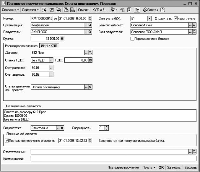 Для ввода и изменения данных в программе предусмотрены интерфейсы редактирования. Пример такого интерфейса (в данном случае показано окно редактирования исходящего платежного поручения) приведен на рис. 1.20.