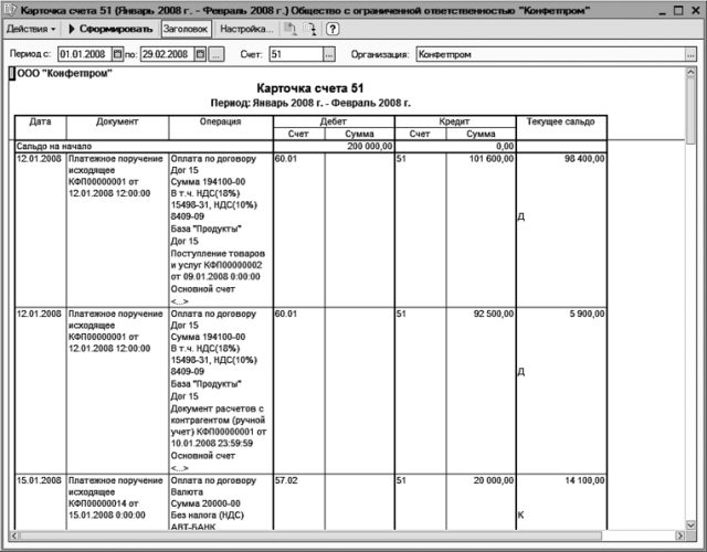 Здесь показано окно настройки и формирования одного из самых популярных отчетов – «Карточки счета», большинство других отчетов формируются аналогичным образом. В верхней части окна задаются параметры формирования отчета (интервал времени, данные которого должны быть включены в отчет, счет бухгалтерского учета или наименование контрагента и др.), а в нижней области окна после нажатия кнопки Сформировать отобразится сам отчет. Позже мы подробно рассмотрим порядок получения наиболее популярных отчетов в программе «1С: Бухгалтерия 8».