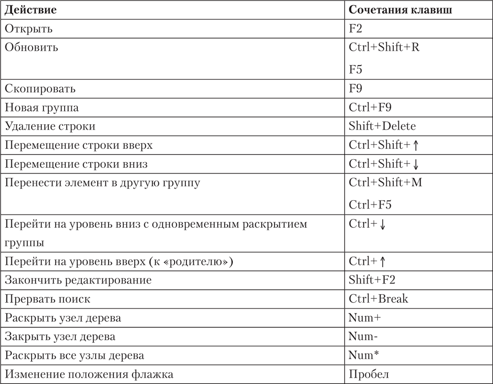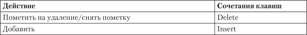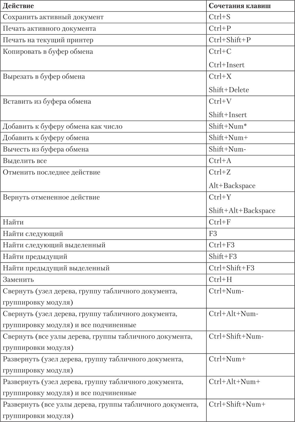 Таблица 1.4. Сочетания клавиш для работы в интерфейсах списка и с иерархическими списками