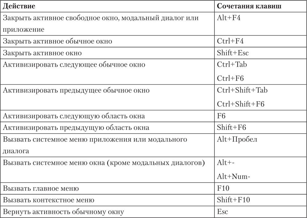 Таблица 1.2. Сочетания клавиш для управления окнами программы