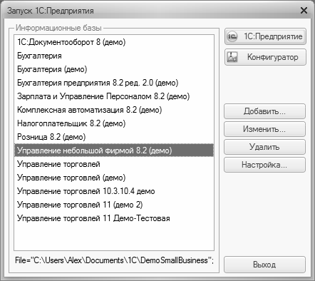 В центральной части окна запуска программы представлен список информационных баз. При первом запуске программы в данном списке может присутствовать информационная база с демонстрационной конфигурацией; эта база входит в комплект поставки и предназначена для предварительного знакомства с системой. Выбор информационной базы осуществляется щелчком мыши на соответствующей позиции списка. Вы можете добавлять в список новые либо редактировать и удалять имеющиеся информационные базы – о том, как это делать, будет рассказано в уроке 5 "Понятие информационной базы”.