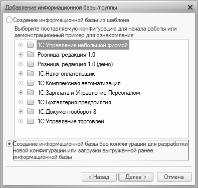 При выборе второго варианта (нижнее положение переключателя) будет создана информационная база без конфигурации. К ней можно будет впоследствии подключить требуемую конфигурацию из соответствующего файла.