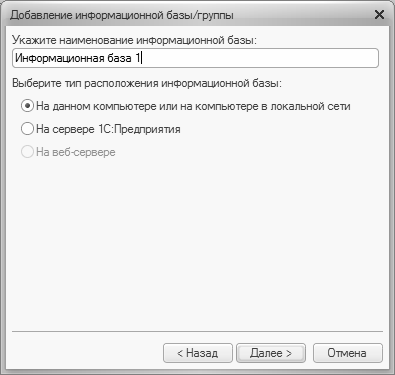 В данном окне в поле Укажите наименование информационной базы нужно с клавиатуры ввести произвольное название создаваемой базы. Под этим именем информационная база впоследствии будет отображаться в списке информационных баз в окне запуска программы (см. рис. 1.1).