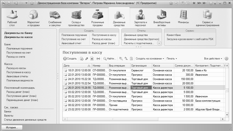 В центральной части главного окна программы отображается содержимое текущего режима работы. Например, если в панели навигации раздела Денежные средства щелкнуть на ссылке Поступления в кассу, то в центральной части интерфейса отобразится список сформированных ранее документов на приход наличных денежных средств (см. рис. 1.6). Если же вы хотите, чтобы содержимое текущего режима работы отображалось в отдельном окне – щелкните мышью на соответствующей ссылке, удерживая нажатой клавишу