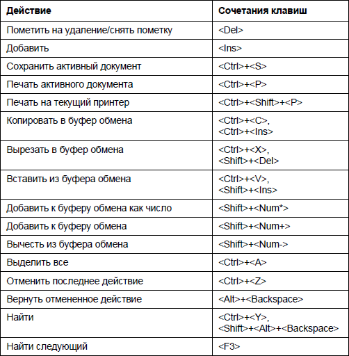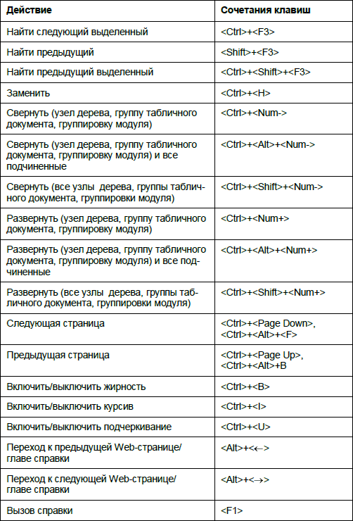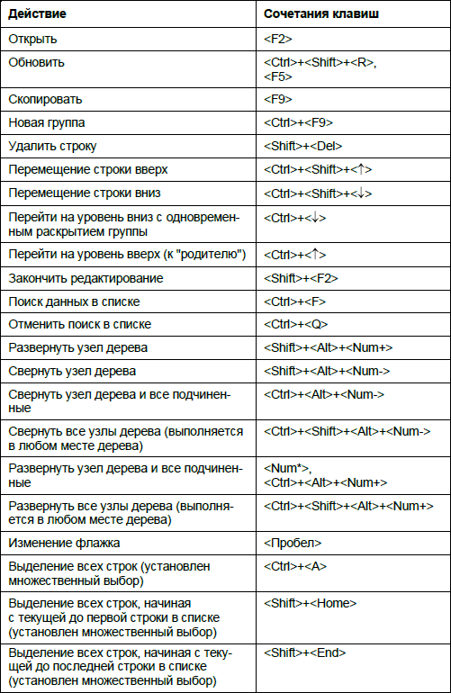 Таблица 1.4. "Горячие" клавиши для работы в интерфейсах списка и с иерархическими списками