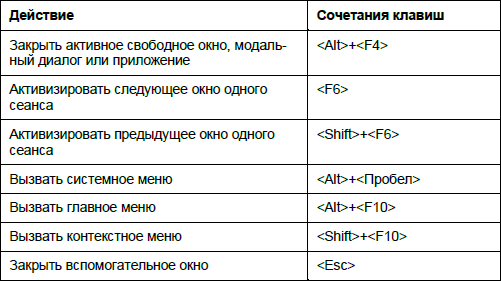 Таблица 1.2. "Горячие" клавиши для управления окнами программы