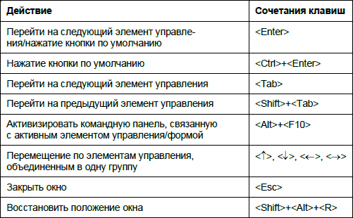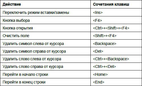 Таблица 1.5. "Горячие" клавиши для работы с полями ввода в окнах редактирования