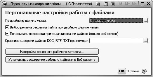 Все изменения, выполненные в режиме персональных настроек работы с файлами, вступают в силу после нажатия кнопки OK. С помощью кнопки Отмена осуществляется выход из данного режима без сохранения выполненных изменений.