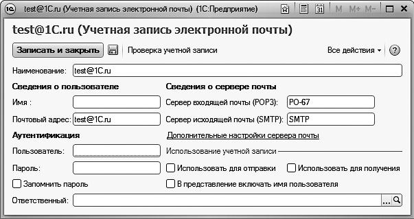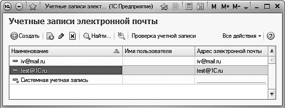 Возможности программы предусматривают ведение списка учетных записей электронной почты. Эти учетные записи необходимы при отправке сообщений по электронной почте. Стоит также отметить, что для корректной работы некоторых механизмов требуется корректная настройка системной учетной записи электронной почты.