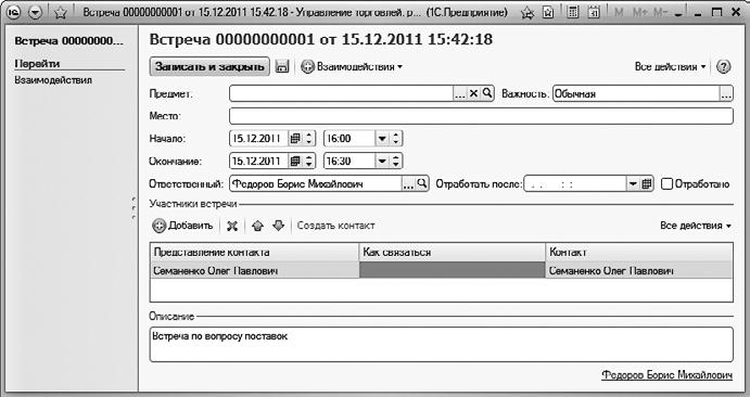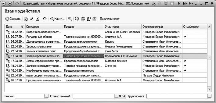 В рассматриваемой конфигурации реализован механизм взаимодействий, который предусматривает возможность дополнительного планирования работы и деятельности пользователя. В данном случае под взаимодействием подразумевается одно из следующих событий: встреча, телефонный звонок или исходящее электронное письмо.