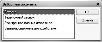 Чтобы запланировать деловую встречу, нужно на панели действий раздела Органайзер выбрать пункт Встреча. Можно также нажать в окне списка взаимодействий кнопку Создать, затем в открывшемся окне (рис. 3.9) выделить пункт Встреча и нажать кнопку OK или клавишу Enter.