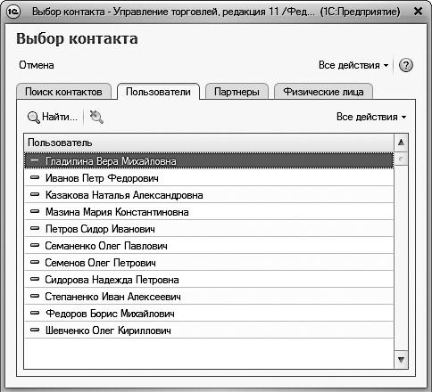 В данном окне нужно открыть вкладку, соответствующую виду контакта, который вы хотите выбрать. После этого выделите контакт (пользователя, партнера или физическое лицо – в зависимости от открытой вкладки) щелчком кнопкой мыши и нажмите клавишу Enter. Если вы затрудняетесь найти требуемое значение, воспользуйтесь механизмом быстрого поиска, который реализован на вкладке Поиск контактов.