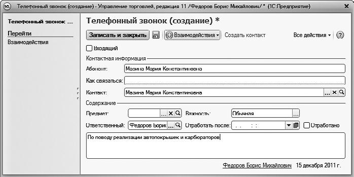 Чтобы запланировать телефонный звонок, нужно в окне списка взаимодействий (см. рис. 3.8) нажать кнопку Создать или клавишу Insert, затем в открывшемся окне (см. рис. 3.9) выделить позицию Телефонный звонок и нажать кнопку OK или клавишу Enter. В результате на экране откроется окно, изображенное на рис. 3.12.
