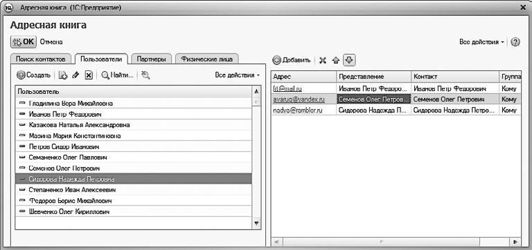 Как видно на рисунке, данное окно состоит из двух частей, причем левая включает в себя несколько вкладок. Первое, что нужно сделать, – открыть вкладку, на которой вы будете выбирать адресатов электронного письма (выбор может осуществляться из справочников пользователей, партнеров и физических лиц). Для поиска контакта (например, если вы не помните, в какой справочник он был внесен, или просто затрудняетесь его найти) используйте вкладку Поиск контактов.