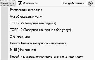 Если в данном окне предусмотрена печать только одного вида документа, после нажатия кнопки Печать на экране отобразится его печатная форма. Чтобы отправить документ на принтер, нужно в окне печатной формы нажать кнопку Печать. Но в окнах редактирования некоторых документов реализована возможность выбора печатной формы документа. В этом случае при нажатии кнопки Печать открывается меню, в котором с помощью соответствующей команды нужно указать требуемую форму. На рис. 4.2 показано меню кнопки Печать для документа Реализация товаров и услуг.