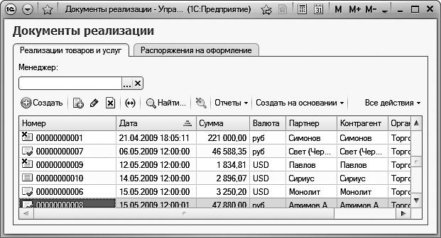Помеченные на удаление объекты обозначаются в окнах списка соответствующим символом (крестиком). На рис. 4.3 показано окно списка документов реализации, в котором имеется два помеченных на удаление объекта (первая и третья позиции списка).