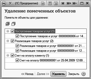 В данном окне содержатся все объекты, которые ранее были помечены на удаление, причем они сгруппированы по типам (документы на поступление, счета на оплату, номенклатурные позиции и т. д.). Нужно с помощью соответствующих флажков выбрать те объекты, которые вы хотите удалить (по умолчанию установлены все флажки), и нажать кнопку Удалить.