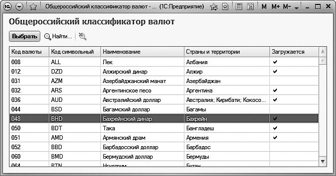 Для добавления в справочник новой валюты можно воспользоваться кнопкой Подбор из классификатора, которая расположена на панели инструментов (см. рис. 5.1). При нажатии этой кнопки откроется окно Общероссийский классификатор валют, изображенное на рис. 5.2.