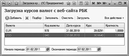 Возможности конфигурации предусматривают загрузку курсов валют с сайта компании «РосБизнесКонсалтинг» (сокращенно РБК) – при условии наличия действующего подключения к Интернету. Для этого нужно на панели инструментов нажать кнопку Загрузка курсов. В результате откроется окно настройки загрузки (рис. 5.3).