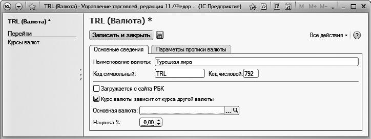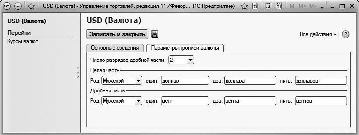 Завершается ввод валютного курса нажатием в данном окне кнопки Записать и закрыть или сочетания клавиш Ctrl+Enter. Чтобы вернуться в основной режим редактирования валюты, щелкните на ссылке с ее названием, которая находится слева вверху окна (на рис. 5.7 эта ссылка называется USD (Валюта)). Для сохранения введенной о валюте информации также нажмите кнопку Записать и закрыть (см. рис. 5.5 или 5.6).