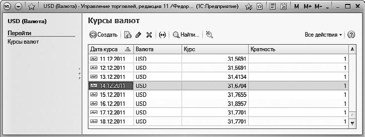 Просмотреть информацию о курсах каждой валюты можно в режиме ее редактирования (об этом будет рассказано чуть ниже).