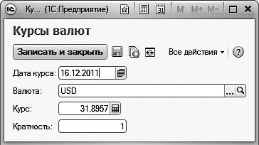 Чтобы вручную ввести курс валюты на определенную дату, нажмите на панели инструментов кнопку Создать или выполните команду Все действия ➧ Создать. Чтобы отредактировать имеющийся курс, выделите в списке соответствующую позицию щелчком кнопкой мыши и нажмите клавишу F2 или выполните команду Все действия ➧ Изменить. Ввод и редактирование валютного курса выполняется в окне, которое показано на рис. 5.8.