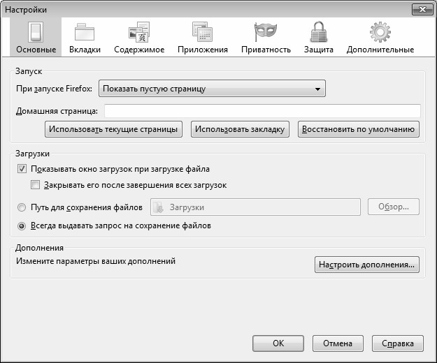 Раздел Основные содержит параметры, к которым пользователи обращаются в первую очередь. Например, многим сразу хочется отключить автоматическую загрузку стартовой страницы, которая предложена авторами программы по умолчанию. Для решения этой задачи нужно в разделе Основные в поле При запуске Firefox из раскрывающегося списка выбрать значение Показать пустую страницу (это значение выбрано на рис. 3.2). Если же вы хотите, чтобы при запуске программы автоматически загружалась какая-то страница, выберите в данном поле значение Показать домашнюю страницу, после чего в поле Домашняя страница введите ее точный адрес. В данном поле можно выбрать и еще одно значение – Показать окна и вкладки, открытые в прошлый раз: в данном случае при запуске Mozilla Firefox будет автоматически загружаться страница (или несколько страниц, открытых на разных вкладках), которые были открыты в момент завершения последнего сеанса работы с программой.