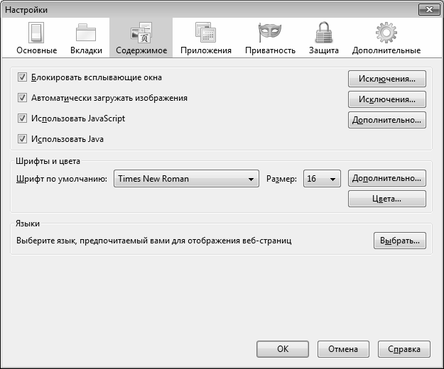 Если на данной вкладке установлен флажок Блокировать всплывающие окна, то программа будет автоматически блокировать всплывающие окна, которые почти всегда носят рекламный характер и только мешают работе. Если вы хотите разрешить использование Java-сценариев, то установите соответствующие флажки.