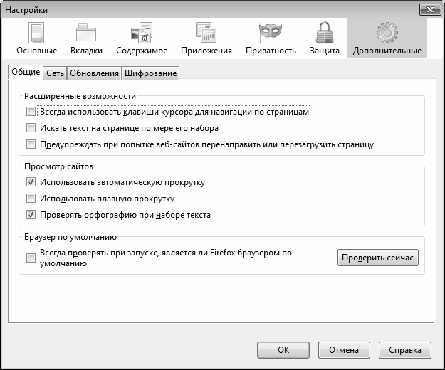 Чтобы при работе в Интернете вас случайно не перенаправили на вредоносный или просто ненужный вам сайт, установите на вкладке Общие флажок Предупреждать при попытке веб-сайтов перенаправить или перезагрузить страницу. При каждом запуске программы можно проверять, является ли Mozilla Firefox обозревателем, используемым по умолчанию – для этого достаточно установить соответствующий флажок, расположенный в области Браузер по умолчанию.