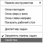 Вы можете использовать режим группировки однотипных кнопок. При этом в области открытых приложений кнопки файлов, открываемых одной программой, будут собраны в меню. Для этого нажмите в свободном месте панели задач правую кнопку мыши и в открывшемся контекстном меню выберите команду Свойства (рис. 2.7).
